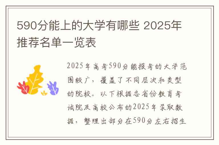 2025年高考590分能报考的大学范围较广,覆盖了不同层次和类型的院校。以下根据各省份教育考试院及高校公布的2025年录取数据,整理出部分在590分左右招生的院校名单,供2026届考生参考。