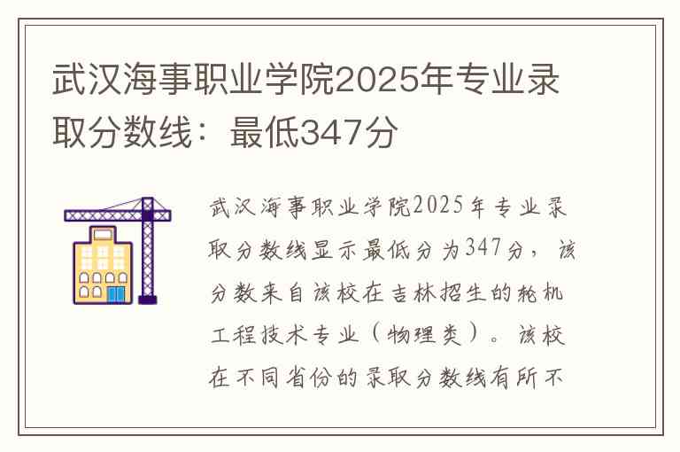 武汉海事职业学院2025年专业录取分数线显示最低分为347分,该分数来自该校在吉林招生的轮机工程技术专业(物理类)。该校在不同省份的录取分数线有所不同,例如在重庆物理类最低分为434分(轮机工程技术专业),在宁夏物理类最低分为355分。具体专业方面,航海技术专业在历史类中的录取分数线较高,如重庆为494分、吉林为404分。