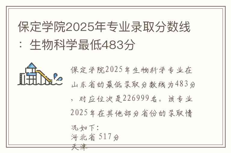 保定学院2025年生物科学专业在山东省的最低录取分数线为483分,对应位次是226999名。