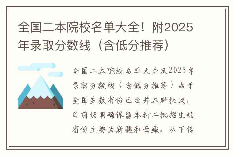 由于全国多数省份已合并本科批次,目前仍明确保留本科二批招生的省份主要为新疆和西藏。以下信息主要依据新疆2025年招生数据整理,供参考。