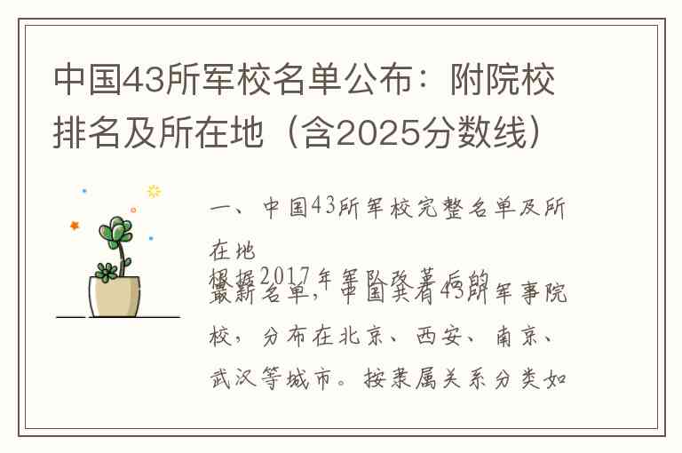 根据2017年军队改革后的最新名单,中国共有43所军事院校,分布在北京、西安、南京、武汉等城市。按隶属关系分类如下: