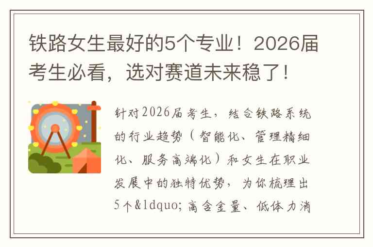 针对2026届考生,结合铁路系统的行业趋势(智能化、管理精细化、服务高端化)和女生在职业发展中的独特优势,为你梳理出5个“高含金量、低体力消耗、发展前景稳”的专业。