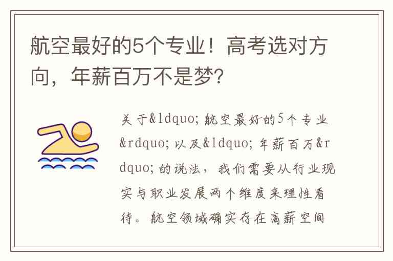 关于“航空最好的5个专业”以及“年薪百万”的说法,我们需要从行业现实与职业发展两个维度来理性看待。航空领域确实存在高薪空间,但“年薪百万”通常对应的是顶尖人才、资深专家或核心管理岗,并非入门即达。