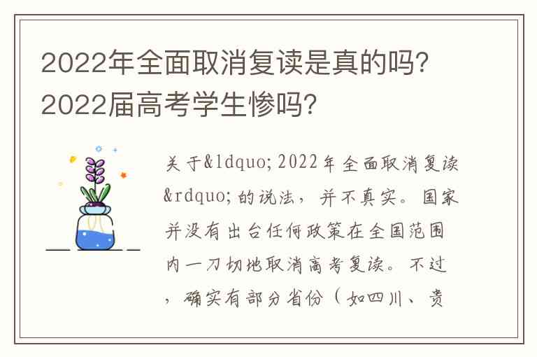 关于“2022年全面取消复读”的说法,并不真实。国家并没有出台任何政策在全国范围内一刀切地取消高考复读。不过,确实有部分省份(如四川、贵州、云南等)的公立学校宣布不再招收复读生,但学生仍可选择私立学校或复读机构进行复读。