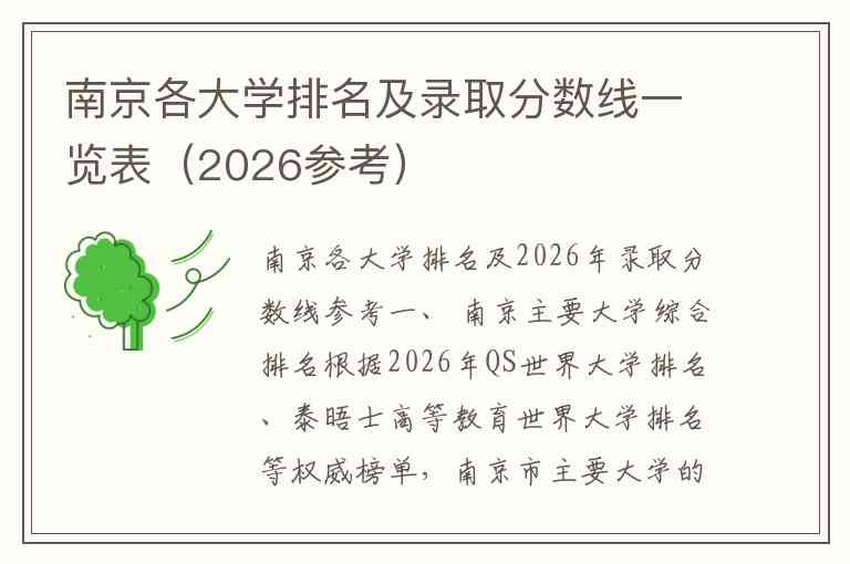 根据2026年QS世界大学排名、泰晤士高等教育世界大学排名等权威榜单,南京市主要大学的综合表现整理如下: