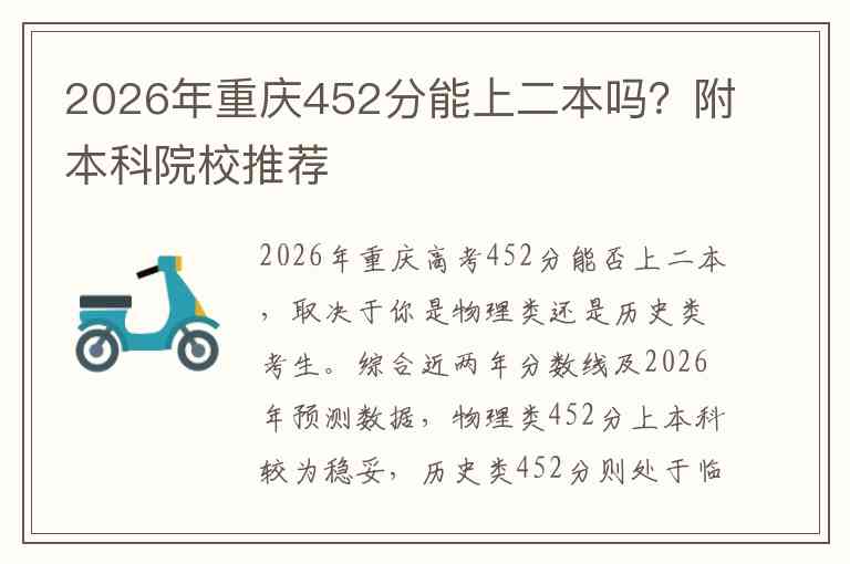 2026年重庆高考452分能否上二本,取决于你是物理类还是历史类考生。综合近两年分数线及2026年预测数据,物理类452分上本科较为稳妥,历史类452分则处于临界点,有较大概率被录取。
