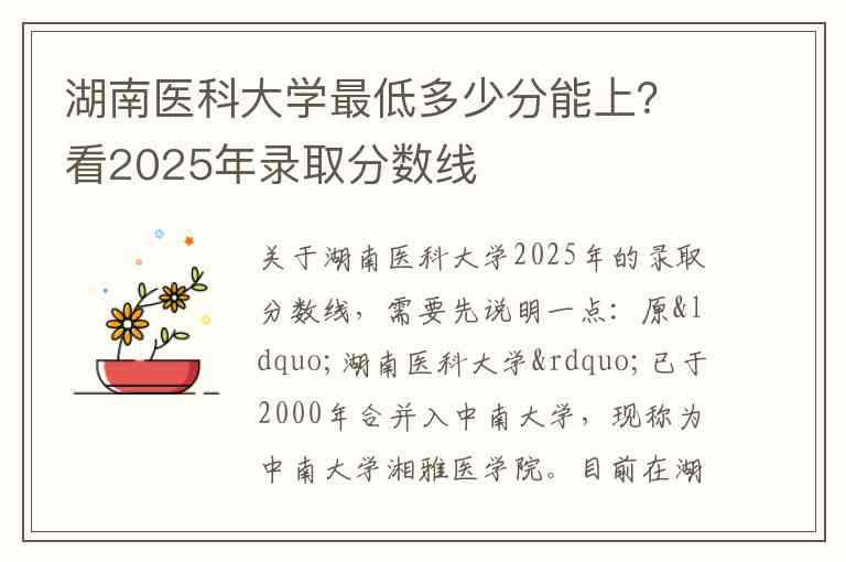 关于湖南医科大学2025年的录取分数线,需要先说明一点:原“湖南医科大学”已于2000年合并入中南大学,现称为中南大学湘雅医学院。目前在湖南省内进行本科招生的主要医学类院校是湖南中医药大学、湖南医药学院等。
