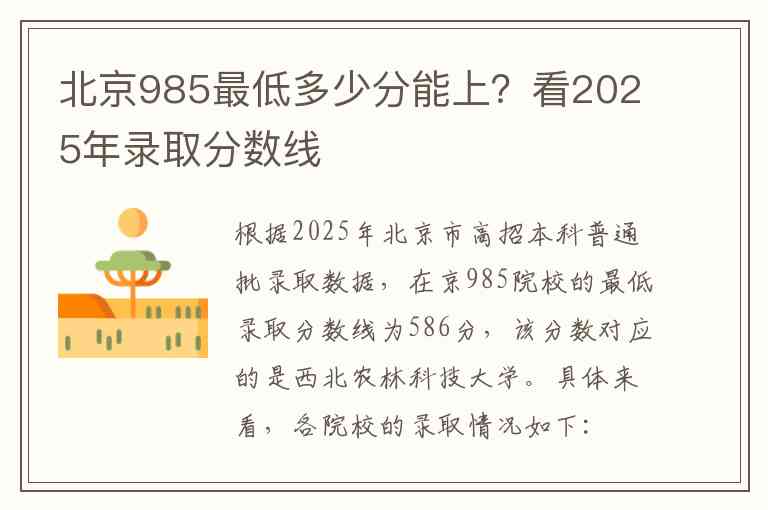 根据2025年北京市高招本科普通批录取数据,在京985院校的最低录取分数线为586分,该分数对应的是西北农林科技大学。