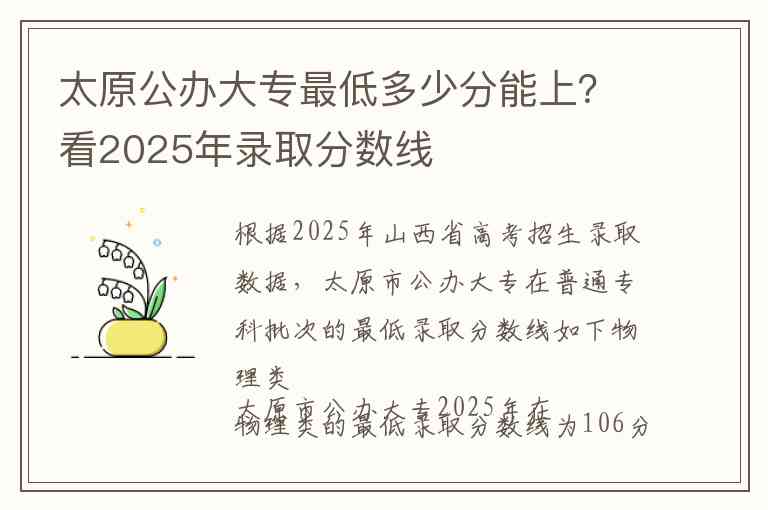太原市公办大专2025年在物理类的最低录取分数线为106分 对应学校为太原幼儿师范高等专科学校 这一分数是当年山西省物理类专科的最低控制线 也是进入太原公办大专的最低门槛