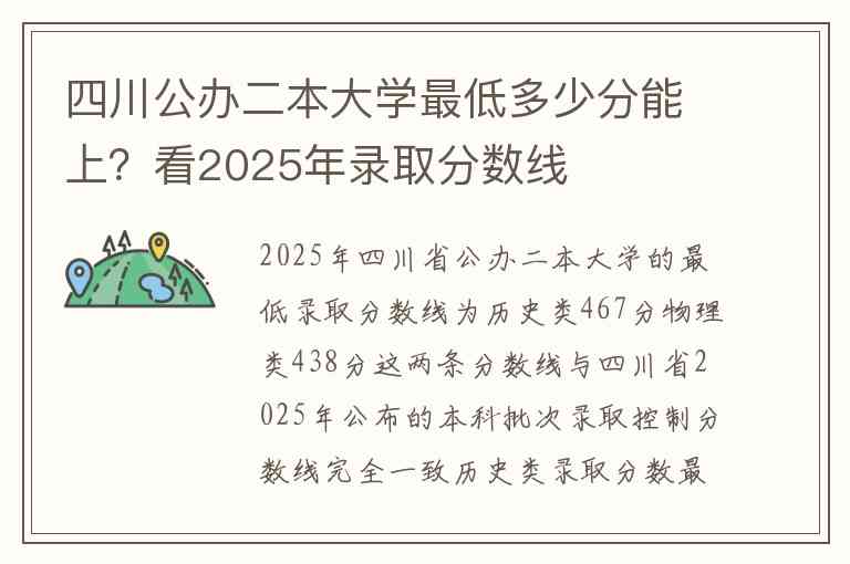 2025年四川省公办二本大学的最低录取分数线为历史类467分物理类438分这两条分数线与四川省2025年公布的本科批次录取控制分数线完全一致