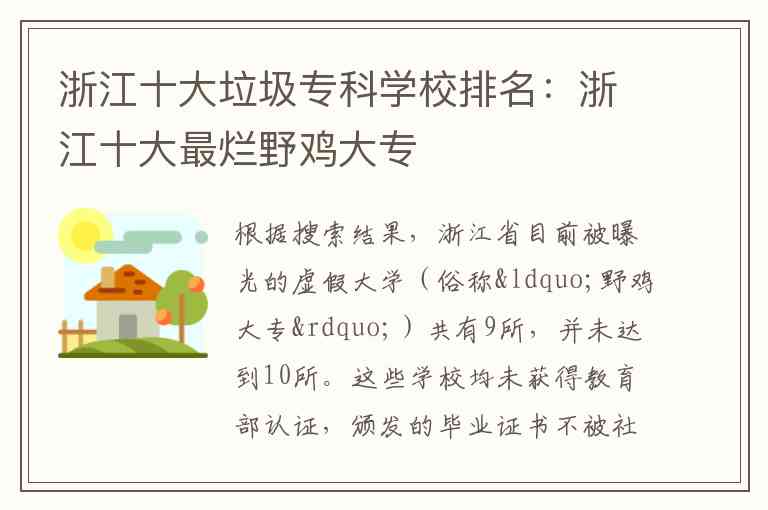 根据搜索结果,浙江省目前被曝光的虚假大学(俗称“野鸡大专”)共有9所,并未达到10所。这些学校均未获得教育部认证,颁发的毕业证书不被社会认可。具体名单如下: