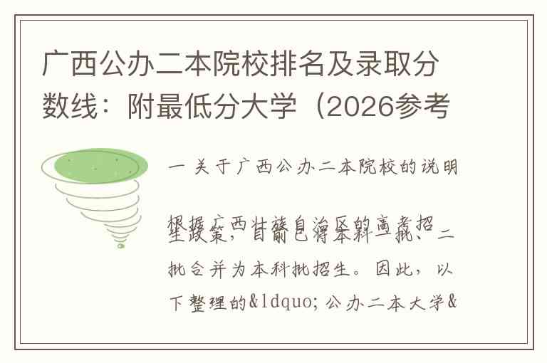 根据广西壮族自治区的高考招生政策,目前已将本科一批、二批合并为本科批招生。因此,以下整理的“公办二本大学”是指办学性质为公办、在本科批招生且录取分数线通常在特殊类型招生控制线(即原一本线)以下的非“双一流”建设高校。以下排名及分数线数据主要基于2025年录取情况,供你参考2026年志愿填报。