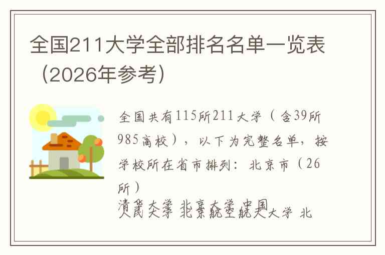 全国共有115所211大学(含39所985高校),以下为完整名单,按学校所在省市排列:
