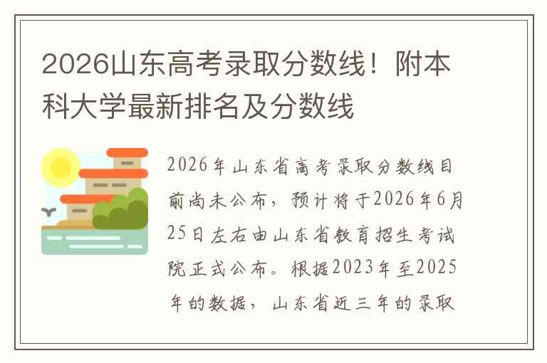 2026年山东省高考录取分数线目前尚未公布,预计将于2026年6月25日左右由山东省教育招生考试院正式公布。根据2023年至2025年的数据,山东省近三年的录取分数线保持稳定,特控线在520分至521分之间波动,一段线在441分至444分之间波动,二段线稳定在150分。若2026年高考人数及招生计划变化不大,可初步预估分数线为特控线521分、一段线443分、二段线150分,此数据仅供参考,最终请以官方公布为准。