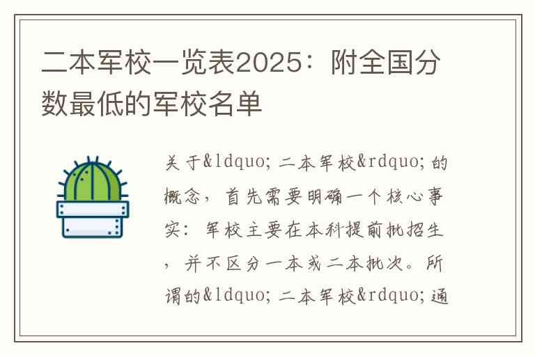 关于“二本军校”的概念,首先需要明确一个核心事实:军校主要在本科提前批招生,并不区分一本或二本批次。所谓的“二本军校”通常是指录取分数线相对较低的院校,或者是在部分省份仍有二本招生的特定专业(如无军籍学员)。