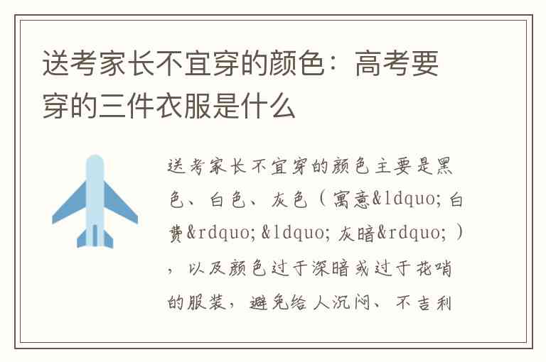 送考家长不宜穿的颜色主要是黑色、白色、灰色(寓意“白费”“灰暗”),以及颜色过于深暗或过于花哨的服装,避免给人沉闷、不吉利的联想。