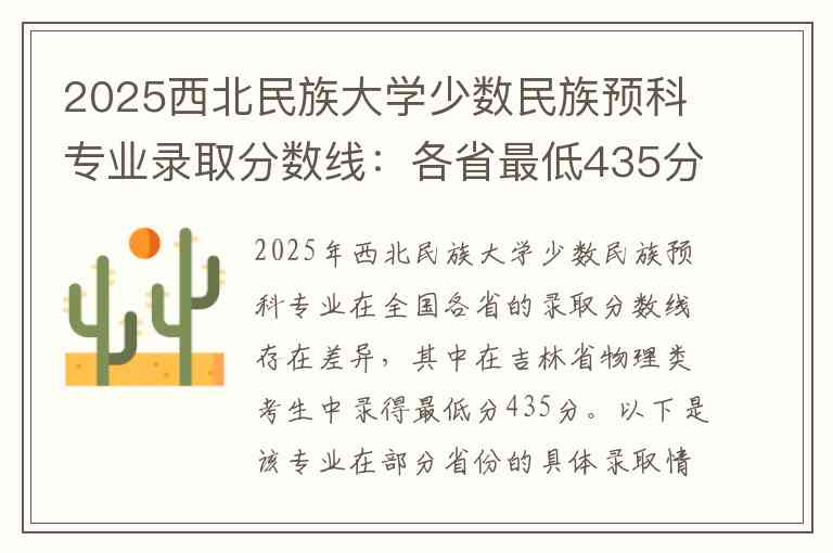 2025年西北民族大学少数民族预科专业在全国各省的录取分数线存在差异,其中在吉林省物理类考生中录得最低分435分。以下是该专业在部分省份的具体录取情况: