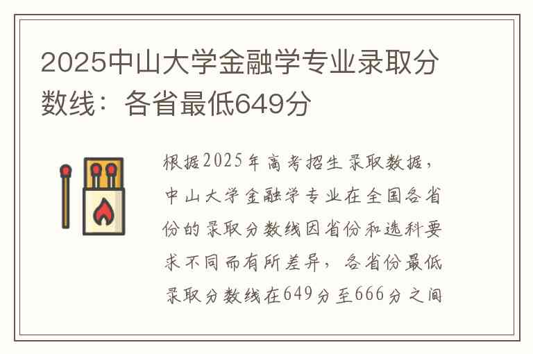 根据2025年高考招生录取数据,中山大学金融学专业在全国各省份的录取分数线因省份和选科要求不同而有所差异,各省份最低录取分数线在649分至666分之间。