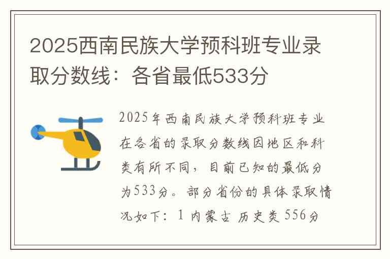 2025年西南民族大学预科班专业在各省的录取分数线因地区和科类有所不同,目前已知的最低分为533分。