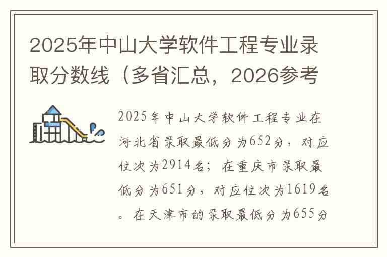 2025年中山大学软件工程专业在河北省录取最低分为652分,对应位次为2914名;在重庆市录取最低分为651分,对应位次为1619名。在天津市的录取最低分为655分。以上为目前已公布该专业具体分数线的省份数据,其他招生省份如安徽、江西、湖南、广东、广西、海南、四川等地的考试院尚未公布2025年专业录取分数线,目前仅能查询到这些省份的招生计划信息。