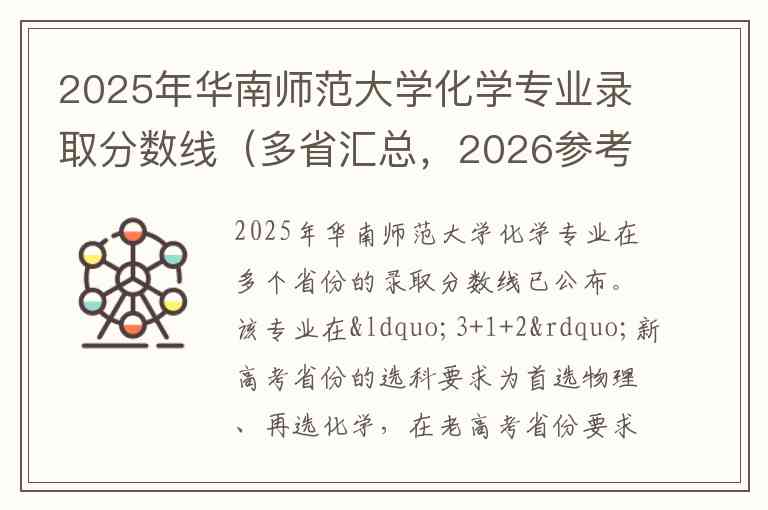 2025年华南师范大学化学专业在多个省份的录取分数线已公布。该专业在“3+1+2”新高考省份的选科要求为首选物理、再选化学,在老高考省份要求为理科生源。以下是目前已公布的部分省份录取分数线汇总,供2026届考生参考。