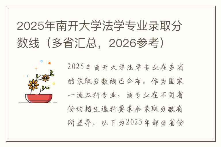 2025年南开大学法学专业在多省的录取分数线已公布。作为国家一流本科专业,该专业在不同省份的招生选科要求和录取分数有所差异。以下为2025年部分省份的录取数据汇总,供2026年考生参考。