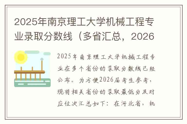 2025年南京理工大学机械工程专业在多个省份的录取分数线已经公布。为方便2026届考生参考,现将相关省份的录取最低分及对应位次汇总如下: