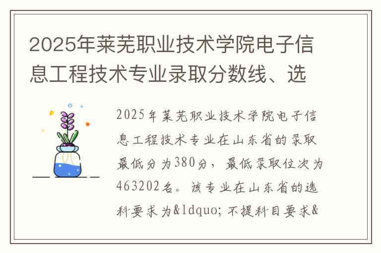 2025年莱芜职业技术学院电子信息工程技术专业在山东省的录取最低分为380分,最低录取位次为463202名。