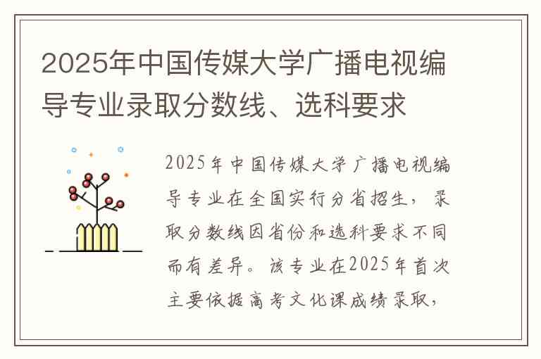 2025年中国传媒大学广播电视编导专业在全国实行分省招生,录取分数线因省份和选科要求不同而有差异。该专业在2025年首次主要依据高考文化课成绩录取,不再组织艺术类校考,被归为艺术类非校考专业。