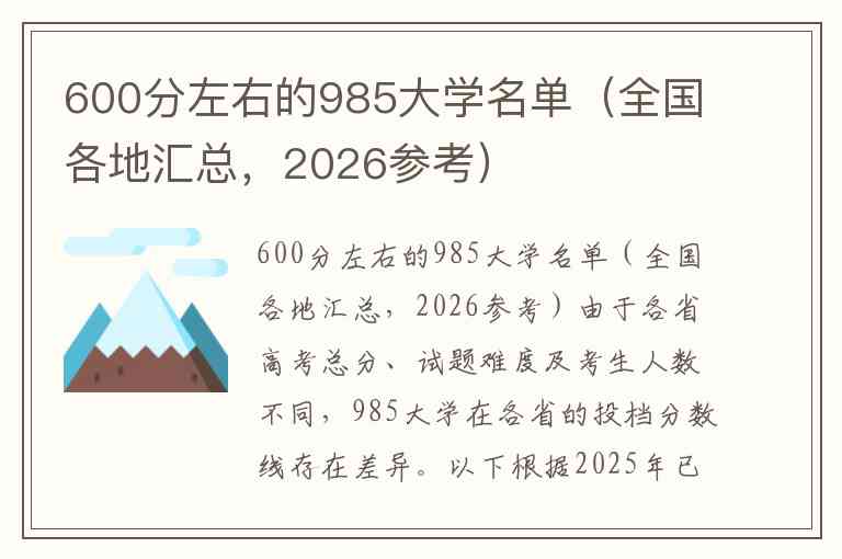 由于各省高考总分、试题难度及考生人数不同,985大学在各省的投档分数线存在差异。以下根据2025年已公布的数据,整理了全国多个省份投档线在600分上下的985大学名单,供2026届考生参考。
