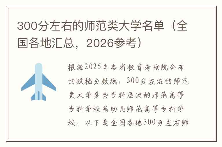 根据2025年各省教育考试院公布的投档分数线,300分左右的师范类大学多为专科层次的师范高等专科学校或幼儿师范高等专科学校。以下是全国各地300分左右师范类大学的汇总名单,供2026年考生参考。