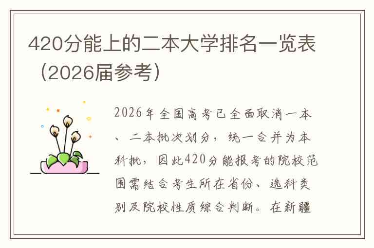 2026年全国高考已全面取消一本、二本批次划分,统一合并为本科批,因此420分能报考的院校范围需结合考生所在省份、选科类别及院校性质综合判断。在新疆、内蒙古等低竞争省份,该分数远超本科线,可稳妥报考公办二本;而在山东、江苏等高分省份,则可能只能选择民办院校或中外合作办学专业。以下是根据2025年录取情况整理的420分左右可报考的二本院校名单及分类说明。
