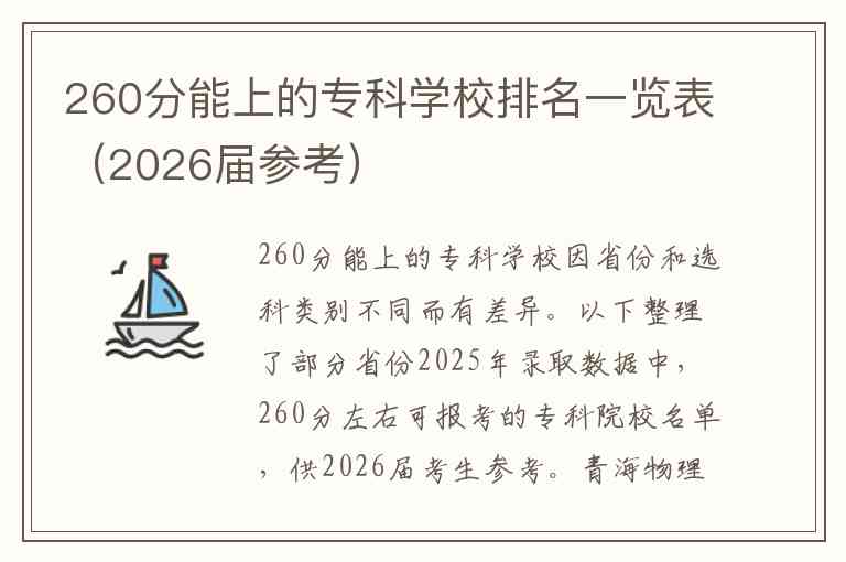 260分能上的专科学校因省份和选科类别不同而有差异。以下整理了部分省份2025年录取数据中,260分左右可报考的专科院校名单,供2026届考生参考。