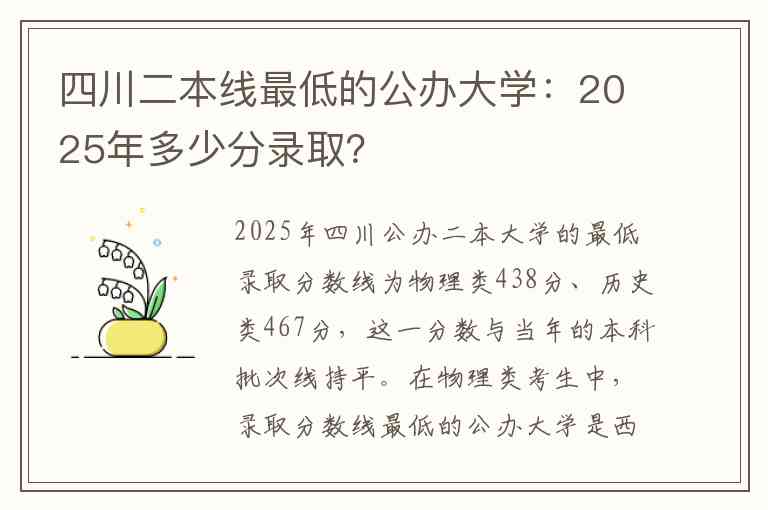 2025年四川公办二本大学的最低录取分数线为物理类438分、历史类467分,这一分数与当年的本科批次线持平。