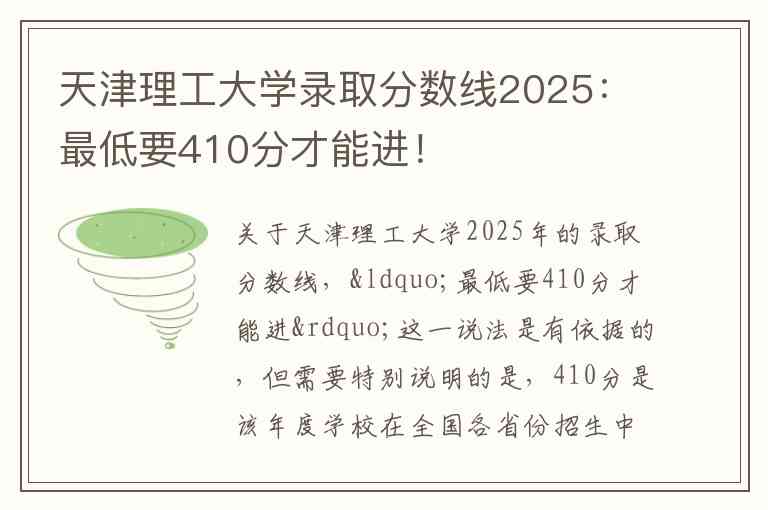 关于天津理工大学2025年的录取分数线,“最低要410分才能进”这一说法是有依据的,但需要特别说明的是,410分是该年度学校在全国各省份招生中出现的物理组最低投档分数,并不代表所有省份或专业的录取要求。