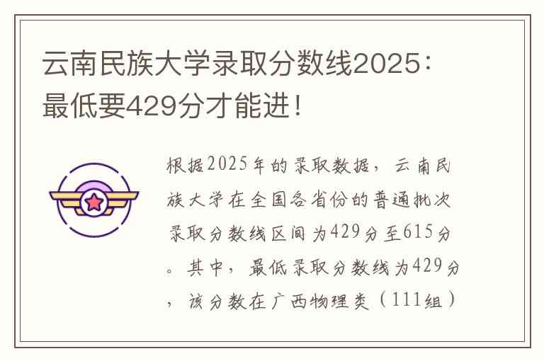 根据2025年的录取数据,云南民族大学在全国各省份的普通批次录取分数线区间为429分至615分。其中,最低录取分数线为429分,该分数在广西物理类(111组)产生。具体到不同科类,物理类/理科的最低录取分数线为429分,历史类/文科的最低录取分数线为440分(在新疆)。需要注意的是,各省份、各专业组之间的录取分数线存在差异,例如在云南省内,历史类本科批不同专业组的录取分数在465分至572分之间。