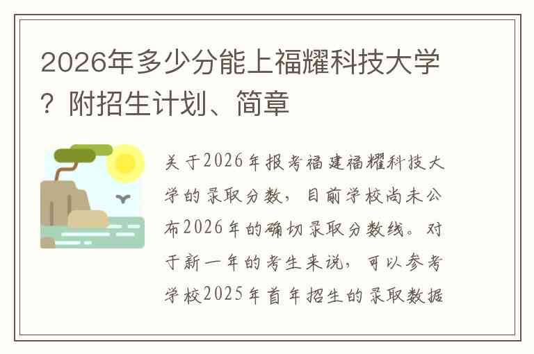 关于2026年报考福建福耀科技大学的录取分数,目前学校尚未公布2026年的确切录取分数线。对于新一年的考生来说,可以参考学校2025年首年招生的录取数据,并结合2026年招生计划的调整来综合判断。