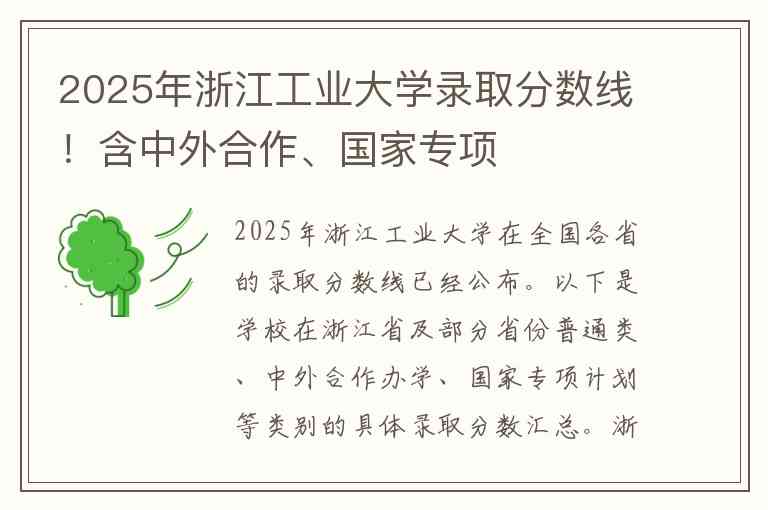 2025年浙江工业大学在全国各省的录取分数线已经公布。以下是学校在浙江省及部分省份普通类、中外合作办学、国家专项计划等类别的具体录取分数汇总。