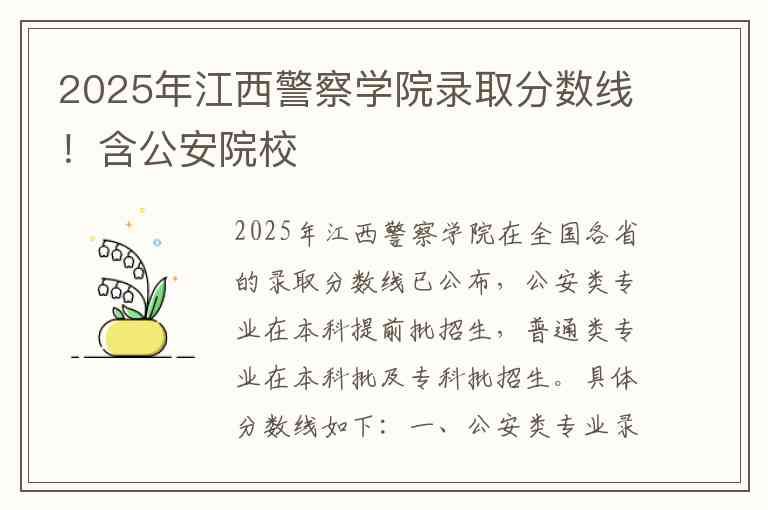 2025年江西警察学院在全国各省的录取分数线已公布,公安类专业在本科提前批招生,普通类专业在本科批及专科批招生。具体分数线如下: