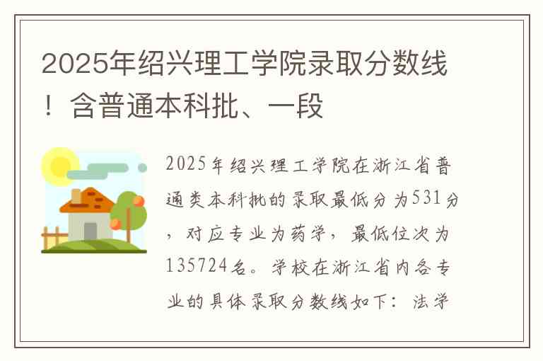 2025年绍兴理工学院在浙江省普通类本科批的录取最低分为531分,对应专业为药学,最低位次为135724名。学校在浙江省内各专业的具体录取分数线如下: