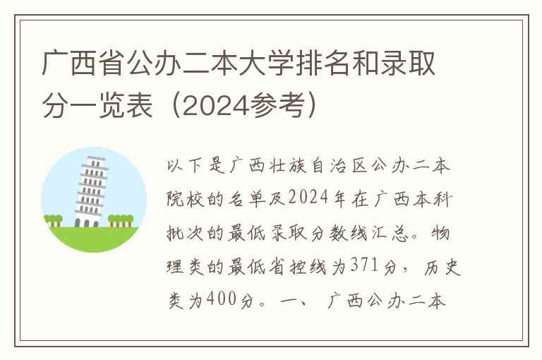 以下是广西壮族自治区公办二本院校的名单及2024年在广西本科批次的最低录取分数线汇总。物理类的最低省控线为371分,历史类为400分。