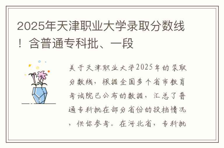 关于天津职业大学2025年的录取分数线,根据全国多个省市教育考试院已公布的数据,汇总了普通专科批在部分省份的投档情况,供你参考。