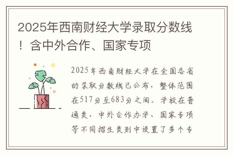 2025年西南财经大学在全国各省的录取分数线已公布,整体范围在517分至683分之间。学校在普通类、中外合作办学、国家专项等不同招生类别中设置了多个专业组,各省录取分数存在差异。以下为部分省份的具体录取情况。