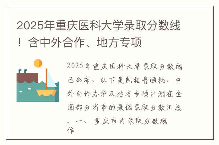 2025年重庆医科大学录取分数线已公布,以下是包括普通批、中外合作办学及地方专项计划在全国部分省市的最低录取分数汇总。