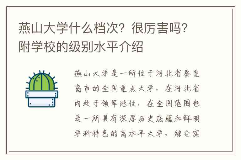 燕山大学是一所位于河北省秦皇岛市的全国重点大学,在河北省内处于领军地位,在全国范围也是一所具有深厚历史底蕴和鲜明学科特色的高水平大学,综合实力强劲,办学层次和水平均属国内高校的第一方阵。