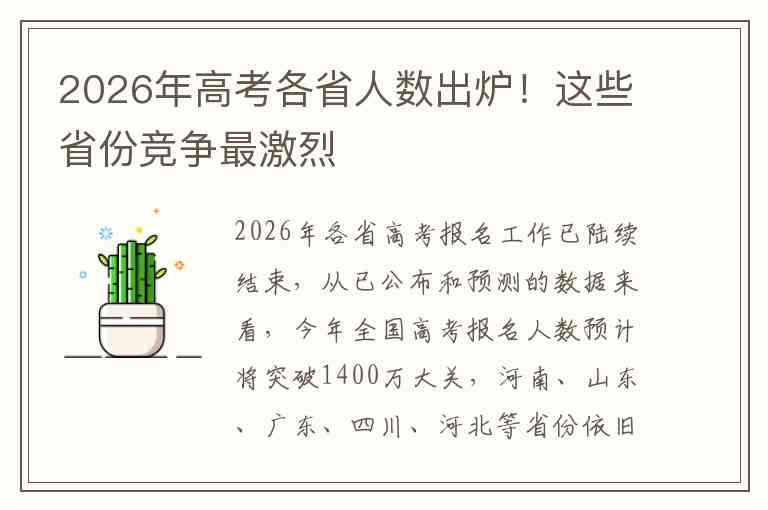 2026年各省高考报名工作已陆续结束,从已公布和预测的数据来看,今年全国高考报名人数预计将突破1400万大关,河南、山东、广东、四川、河北等省份依旧稳居考生规模前列,竞争压力尤为突出。