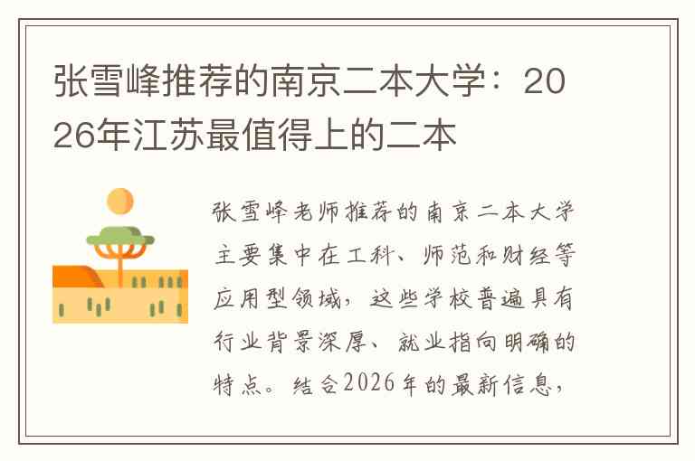 张雪峰老师推荐的南京二本大学主要集中在工科、师范和财经等应用型领域,这些学校普遍具有行业背景深厚、就业指向明确的特点。结合2026年的最新信息,以下几所位于南京的二本院校被认为是最值得报考的: