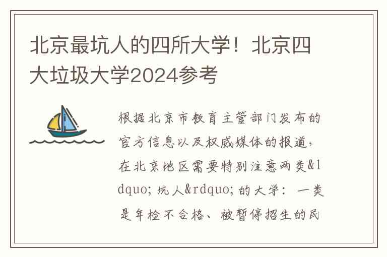 根据北京市教育主管部门发布的官方信息以及权威媒体的报道,在北京地区需要特别注意两类“坑人”的大学:一类是年检不合格、被暂停招生的民办非学历高等教育机构,另一类是教育部曾点名曝光的“野鸡大学”(虚假大学)。