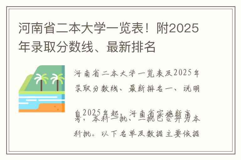 自2025年起,河南省实施新高考,本科一批、二批已合并为本科批。以下名单及数据主要依据2025年河南省教育主管部门公布的具有普通高等学历教育招生资格的本科层次院校,并结合2025年实际招录数据整理。文中“二本大学”主要指在本科批录取、非双一流的公办及民办院校,供参考。