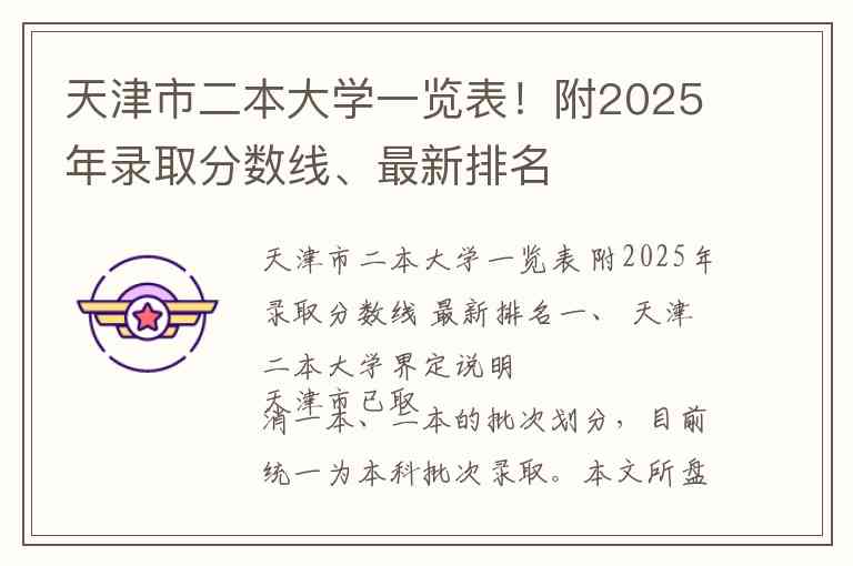 天津市已取消一本、二本的批次划分,目前统一为本科批次录取。本文所盘点的“二本大学”,主要指在天津本地及多数外省份于本科批B阶段(原二本)招生,或录取分数线低于特殊类型招生控制线(2025年为562分)的公办及民办本科院校。以下信息综合了2025年的录取数据和最新排名,供2026届考生参考。